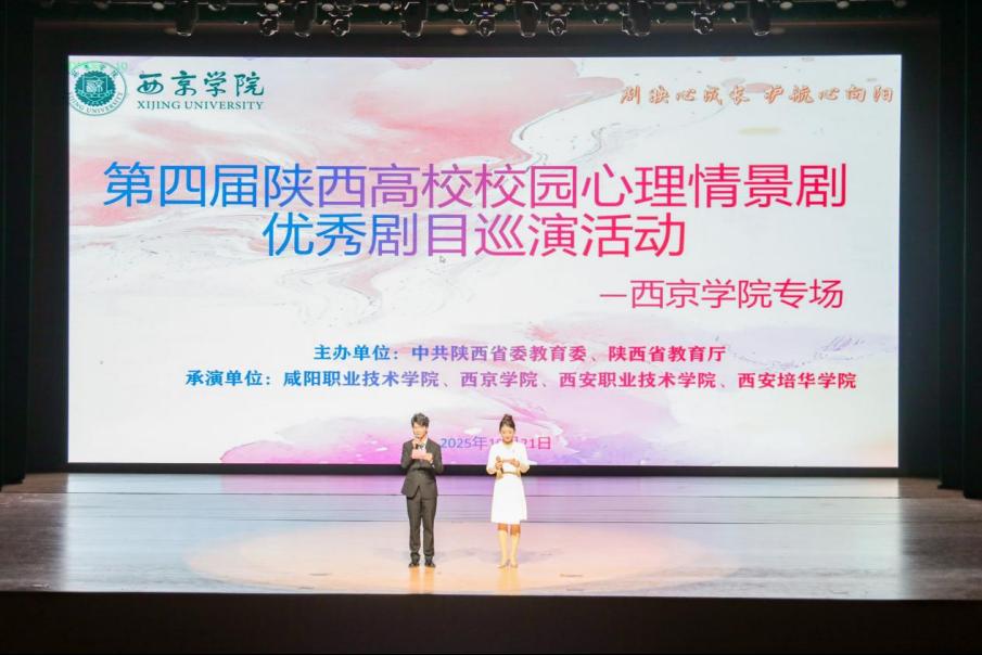 西京网讯:10月21日晚,第四届陕西高校校园心理情景剧优秀剧目巡演西京学院专场举行。活动由陕西省教育厅、中共陕西省委教育工委联合主办,西京学院承办,采用“线下展演+全程直播”模式进行。巡演现场吸引校内外师生代表1700余人次参与,线上直播覆盖全省高校,累计观看量突破2万人次,扩大了心理教育的辐射范围。