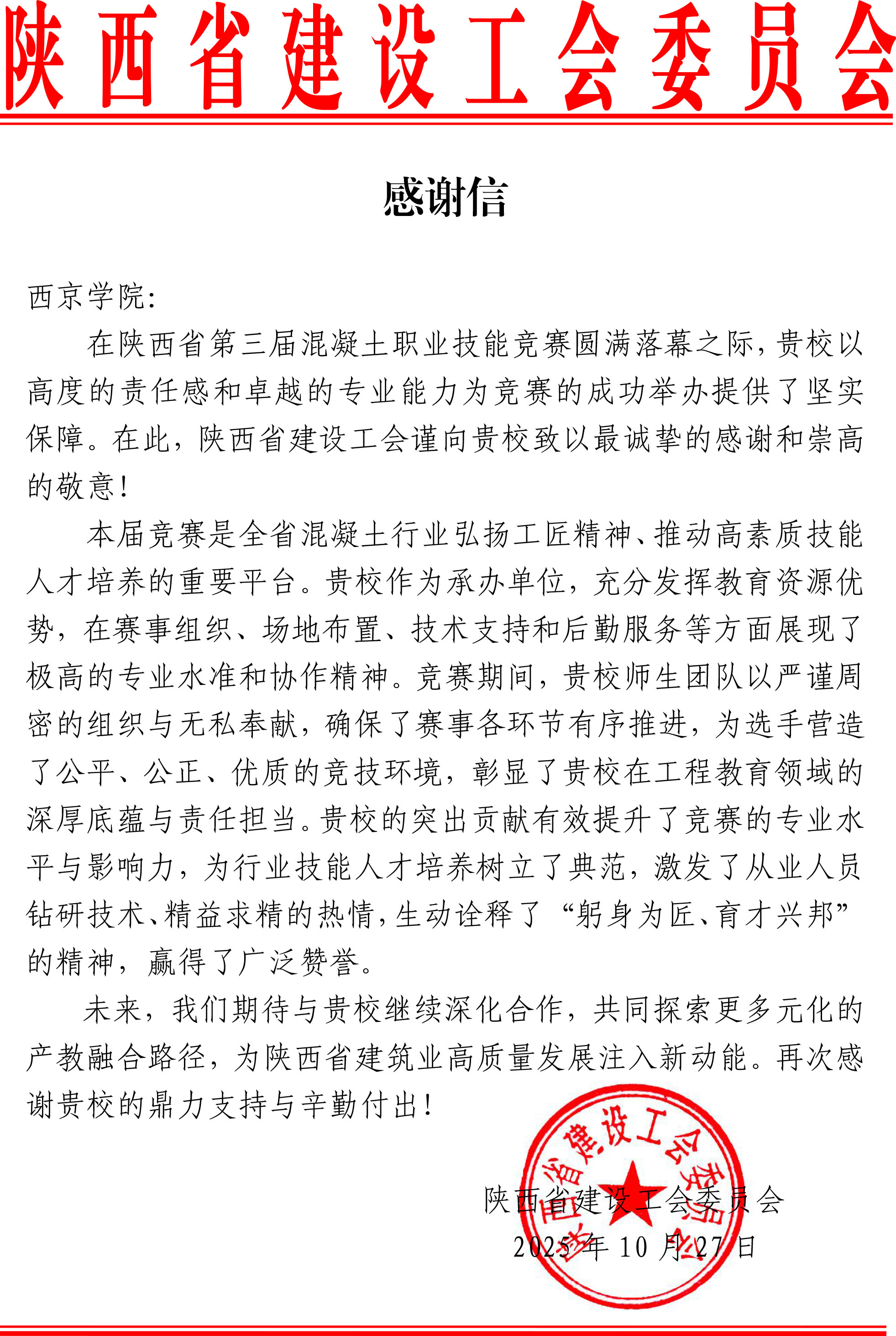 陕西省建设工会委员会在赛后专门向西京学院致感谢信,对学校在赛事组织、场地布置、技术支持和后勤服务等方面展现出的极高专业水准和协作精神表示诚挚感谢。信中指出,西京学院师生团队以严谨周密的组织与无私奉献,确保了赛事各环节有序推进,为选手营造了公平、公正、优质的竞技环境,有效提升了竞赛的专业水平与影响力,为行业技能人才培养树立了典范。
