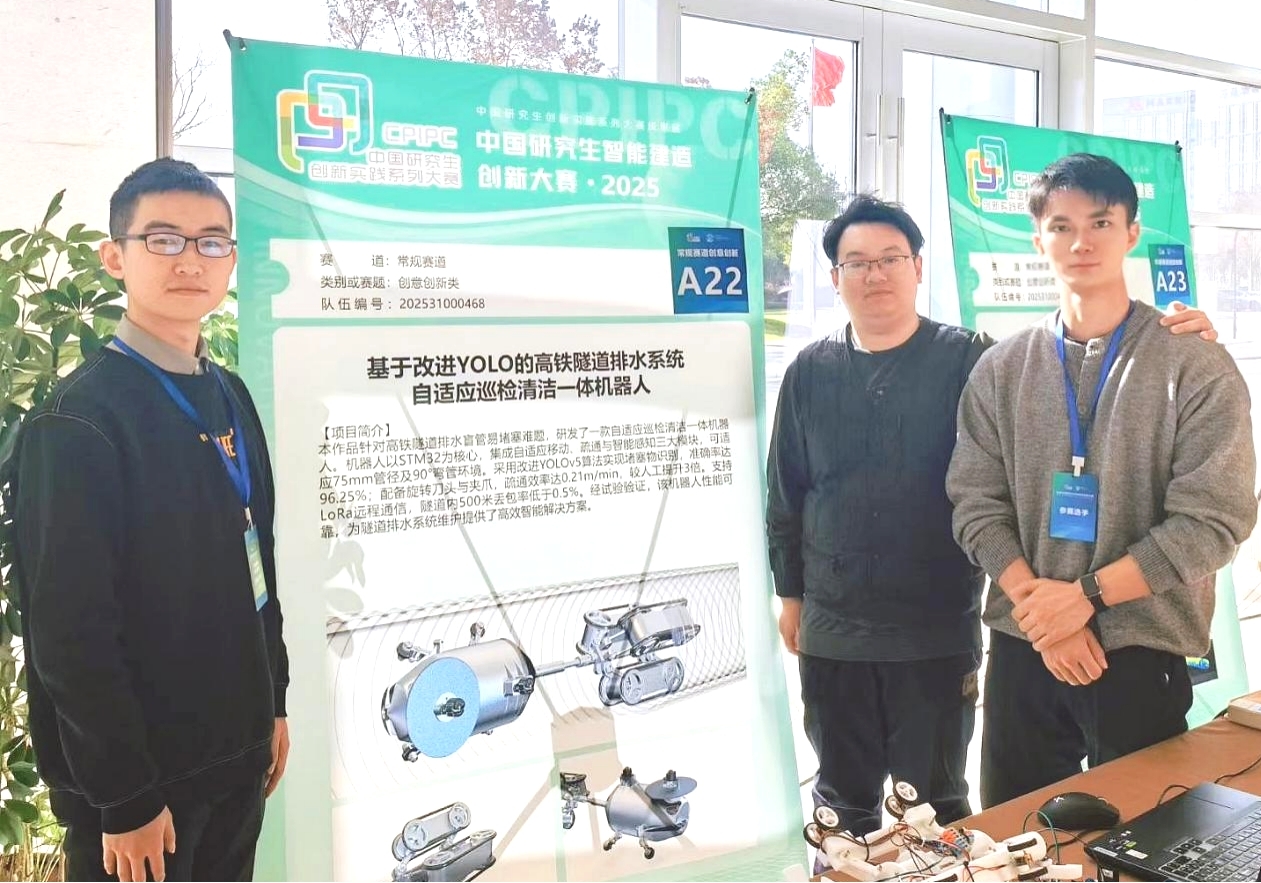 机械工程学院两支参赛队伍在比赛中同样脱颖而出,获得国家二等奖1项、国家三等奖1项。在常规赛道-创意创新类项目中,由王孜凯、邬晓华、赵康、李佳辉等同学组成的团队,凭借“基于改进YOLO的高铁隧道排水系统自适应巡检清洁一体机器人”项目荣获国家二等奖。该项目聚焦轨道交通运维的前沿创新,借助改进YOLO算法赋能机器人技术,研发出一体化巡检清洁机器人,实现了对高铁隧道排水系统的高精度巡检与高效清洁。在常规赛道-应用创新类项目中,由邬晓华、王孜凯、王涵、张权等同学组成的团队,以“离岸供电解决方案——基于TENG振荡阵列驱动的全海底振荡式波浪能发电系统”项目获得国家三等奖。该项目深度融合TENG技术与新能源发电原理,研发出全海底振荡式波浪能发电系统,为远海工程供电及海洋清洁能源开发提供了创新路径。
