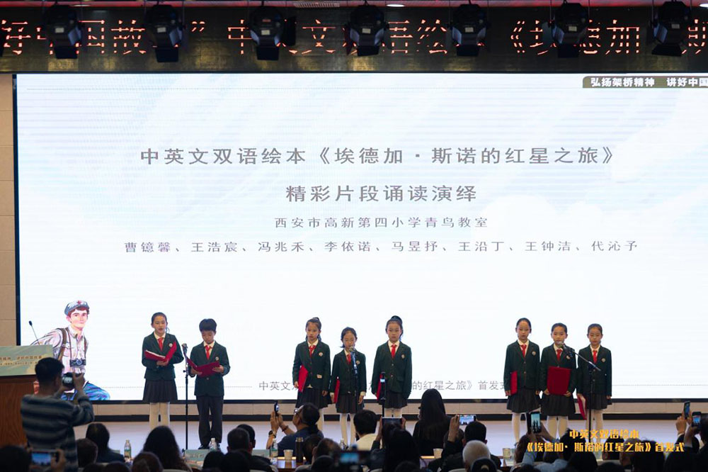 图说:来自西安市高新第四小学青鸟教室的同学们,用中英双语深情诵读了绘本中的精彩片段,赢得了全场热烈掌声。