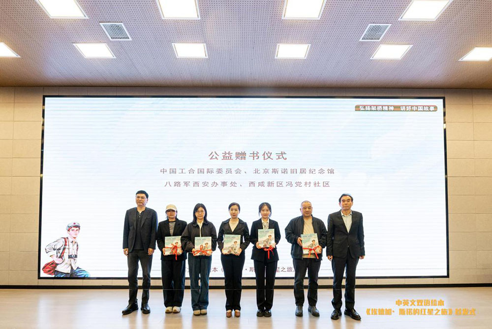 活动现场,主办单位代表和创作团队成员还分别向中国工合国际委员会、北京斯诺旧居纪念馆盔甲厂宾馆、八路军西安办事处、西咸新区冯党村社区、西安“跟着斯诺去延安”研学营、西安“Wise维斯英文阅读俱乐部”、西京小学、西京学院幼儿园、西安高新第四小学青鸟教室、长安区徐家寨社区向阳花儿童绘本馆赠书。