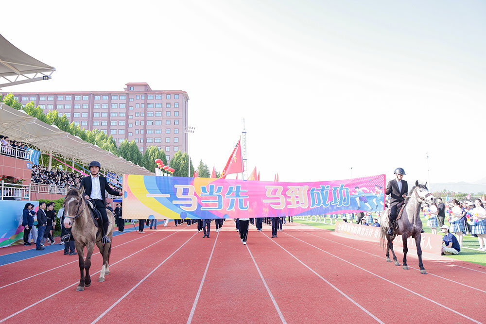 万钧书院的《文韵承千秋,扬帆向未来》则展现了另一种美学风格:一袭长袖轻扬,超大山水屏风徐徐铺展,笔墨挥毫间,书法艺术与古典舞相融,诠释着学校“匠心精神+艺术素养”的人才培养特色,蓝调船桨破风、绸扇逐光,学子们以文化底蕴铸就青春风帆。行健书院以“策马”为意象,“骐骥驰骋,势不可挡”的横幅彰显着青春的昂扬姿态,舰船造型从“扬帆远航”到“成功上岸”的队形变换,将升学梦想与奋斗精神熔铸为可感的集体记忆,在青春赛道上策马奔腾、追求卓越。创业书院将科技元素融入表演,“小爱同学,2035年是什么样的”的对话,呼应着国家现代化建设的时代主题,人工智能与商科思维在丝路背景中交汇,昭示着西京人扎根西部、敢闯敢创的使命担当。