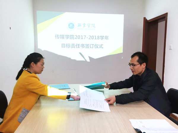 西京网讯:10月20日下午,传媒学院召开2017—2018学年工作目标责任书签订大会。张西静院长与各行政科室及全体教师签订了目标责任书。