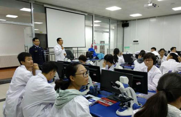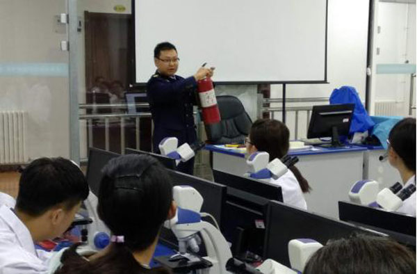 首先,实验室主任刘学通简单介绍了医学护理实验教学中心,重点强调学生上实验课着装规范和做实验安全操作规范。其次校保卫处赵振老师为同学们认真讲解了实验室安全的重要性,特殊药品的使用,旨在提高新生的安全意识;之后,赵振细心地向全体学生讲述如何使用消防器材,如防火沙,自救呼吸器和灭火器等。最后以灭火器为例,总结了使用灭火器的正确步骤:一拔二提三喷射,并进行了演示,增强了学生的自救能力。他还通过生活中的具体事例,告诫同学们在上实验课一定要听实验指导老师的话,按照正确的操作步骤有序实验。