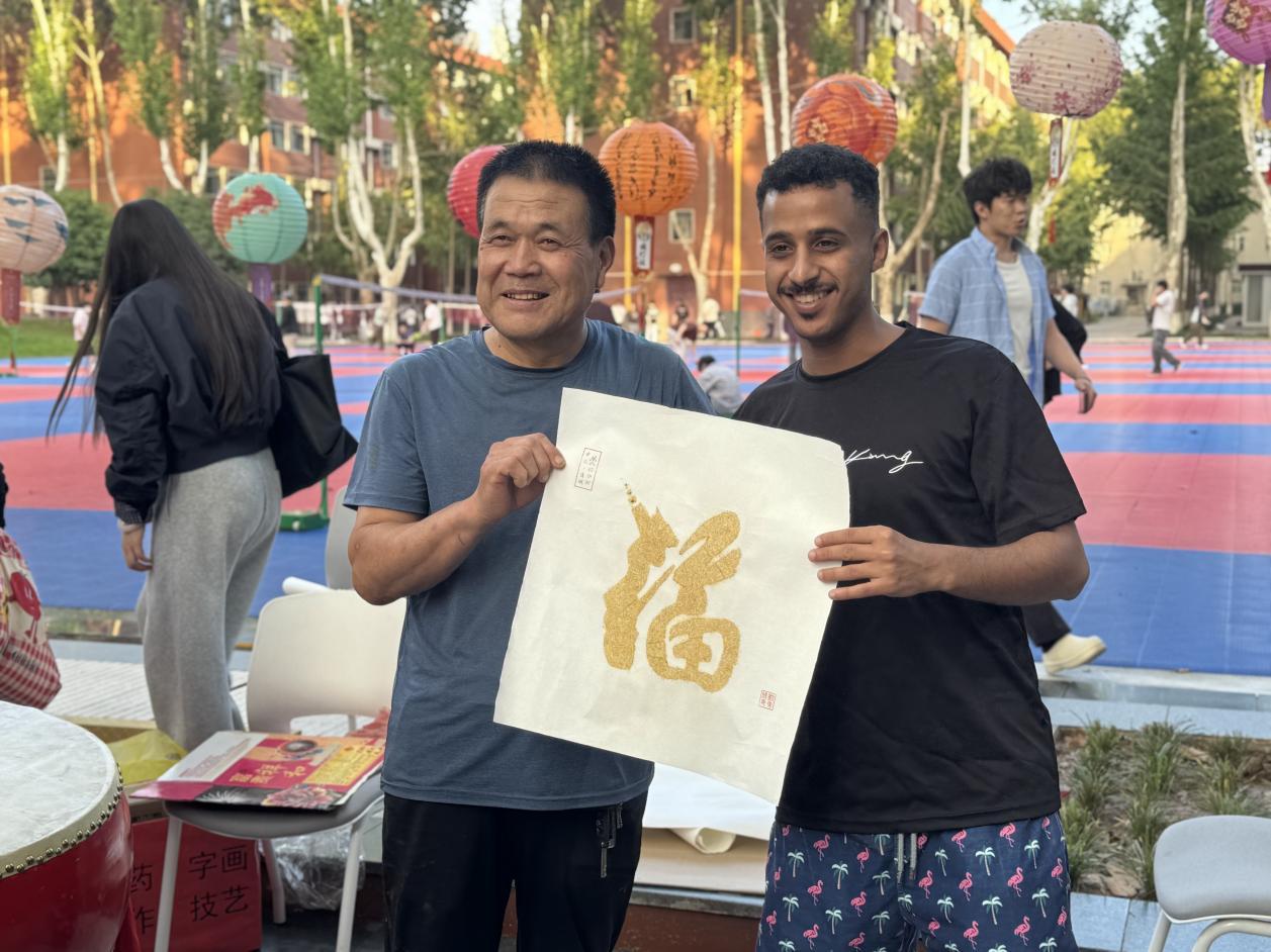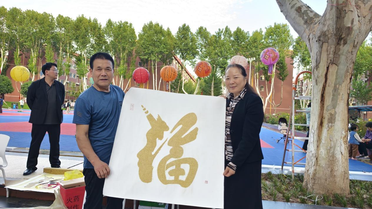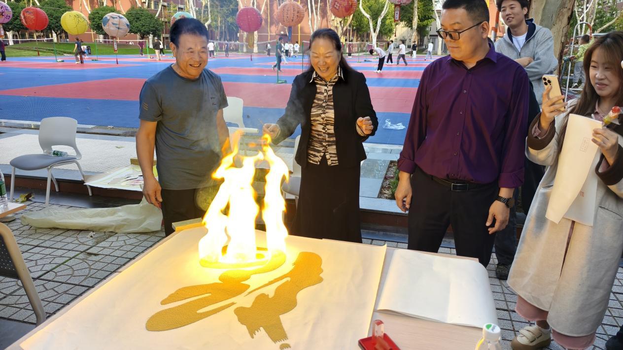 活动现场,中国火药字画展演区是最耀眼的焦点。非遗传承人刘麦成老师手持特制火药,以火药为“画笔”,在洁白宣纸上轻轻点燃。火药与纸张接触的刹那,金色纹路如绚烂星河迅速绽放,一幅龙凤“福”字画瞬间成型。那龙凤似被赋予了灵动的生命,在火焰的跃动中翩翩起舞,引得在场师生纷纷发出惊叹。火药本是危险之物,却在刘老师手中化为创造美的神奇工具,完成了从危险到艺术的惊艳蜕变。这不仅彰显了非遗传承人精湛的技艺,更凸显了中华民族对传统文化勇于创新、积极传承的精神。表演结束后,刘老师还向师生展示火药字画的防燃处理技术,详细讲解安全保存之法,消除了大家的顾虑。师生们围拢过来,仔细观察、踊跃提问,刘老师始终耐心解答。