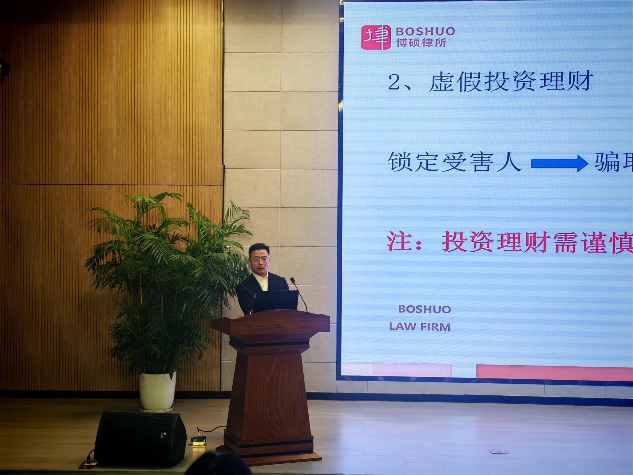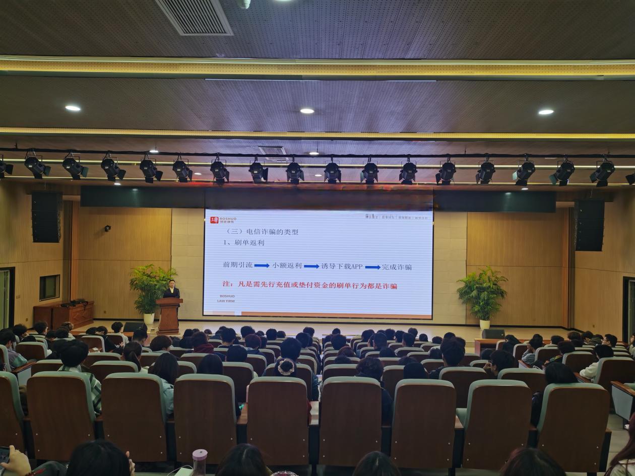 讲座伊始,刘文律师以近期发生的真实诈骗案例为切入点,深入剖析了电信诈骗的常见类型与作案手法。他指出,电信诈骗具有行为隐蔽、分工细化、跨地域突出等特点,常见类型包括刷单返利、虚假投资理财、虚假网络贷款、冒充客服及公检法诈骗等。刘律师特别强调,凡是需先行充值或垫付资金的刷单行为、以“无抵押”“免征信”为幌子的虚假贷款、要求转账到“安全账户”的公检法诈骗等,均为典型诈骗手段,务必提高警惕。