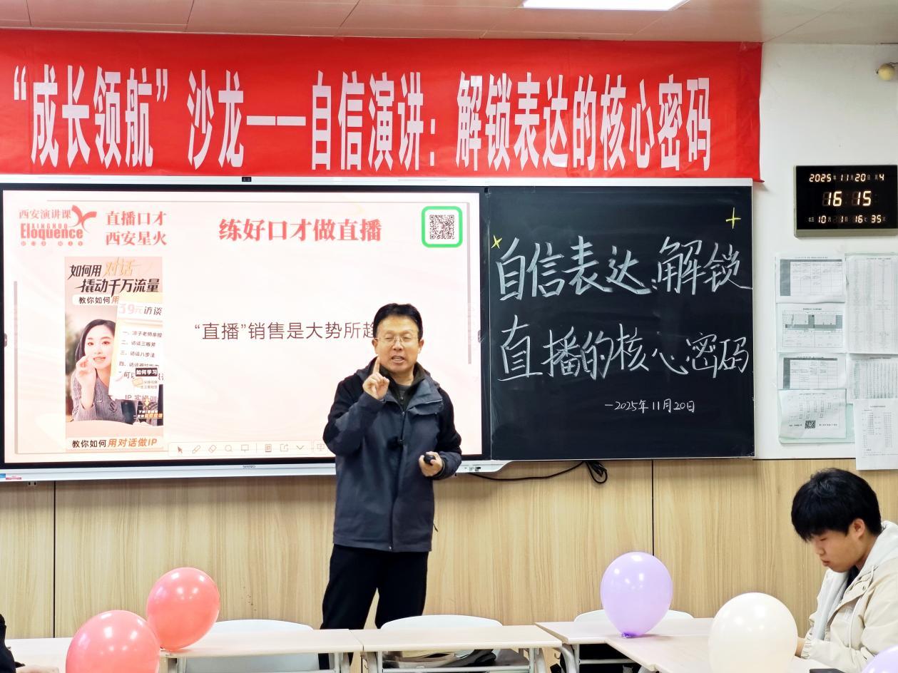 针对“应对直播突发状况”“打造个人风格”等疑问,他分享“真、准、活”直播表达三字诀,并鼓励学子通过日常练习、镜头复盘、校园实践积累经验。