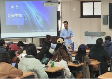 姜琦博士身为干细胞研究专家,于演讲中阐述了干细胞领域先进的干细胞分离、纯化、诱导等前沿技术。他还分享了基于这些技术成果转化所研发的一系列干细胞抗衰产品。姜博士以幽默风趣且深入浅出的方式进行专业讲解,令现场师生兴致浓厚。在交流互动环节,众人就技术发展与产品应用开展了多次积极交流。