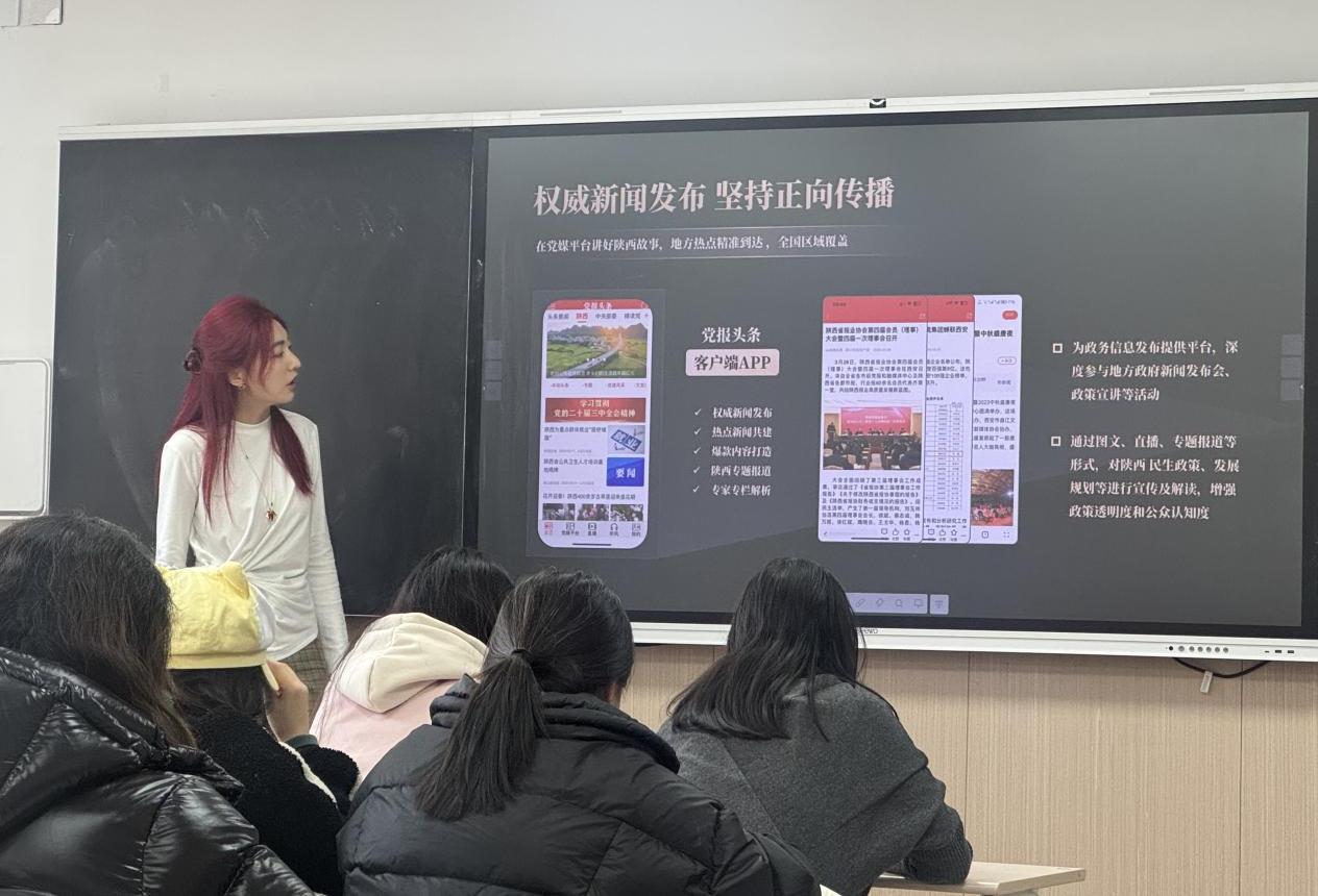 课程伊始,王翾以新旧媒体融合发展为时代背景,介绍了《党报头条》在媒介融合过程中的创新探索与实践成果,重点分享了头条在新媒体矩阵搭建、本土热搜话题打造、官方直播运营、达人合作联动、企业品牌传播等方面的成功案例。其中,鸿星尔克线上线下融合直播、六福珠宝情人节主题策划、德福巷达人广告、陕西交控研学活动等鲜活案例,极大激发了同学们的实践兴趣与创作热情。