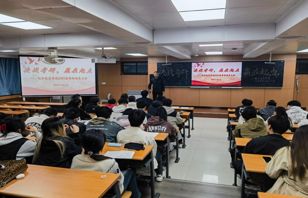 为进一步激发学生考研热情,明确备考目标与路径,强化考研指导服务,3月11日,电子信息学院在2222 教室召开2027届考研动员大会。学院学工办主任段领主持会议,学院相关老师及2027届有志考研学生共100余人参加会议。