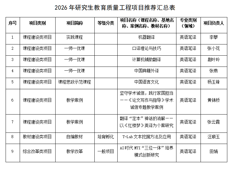 研究生培养体系持续完善。学院积极构建“四位一体”研究生培养模式,扎实推进研究生教育质量工程建设,平稳有序完成2026年翻译硕士研究生招生工作;审议研究研究生教改项目《AI赋能MTI研究生培养模式创新研究》,为新时代研究生培养注入创新动能。