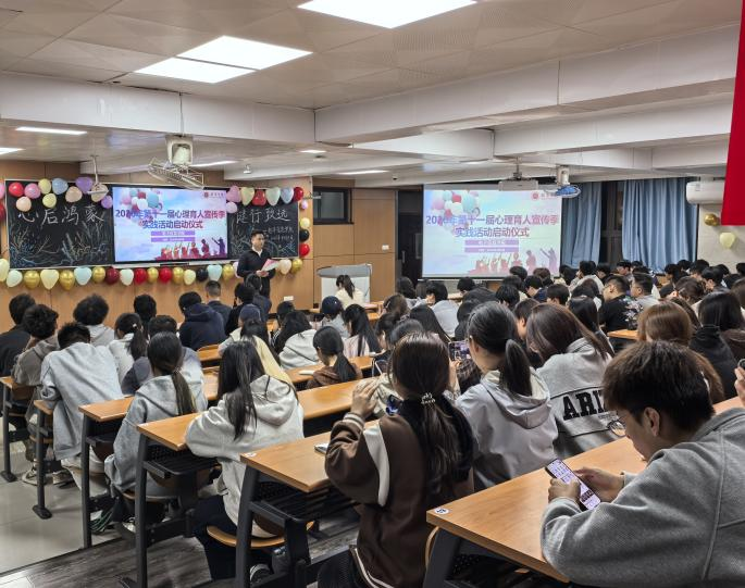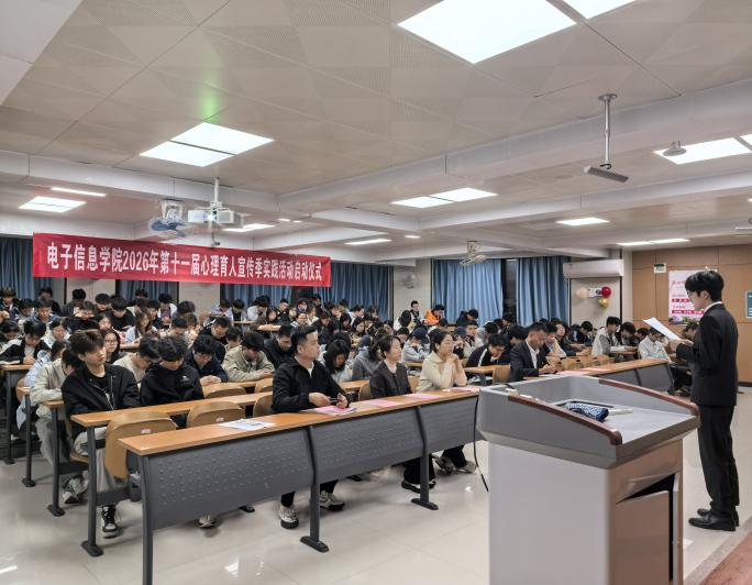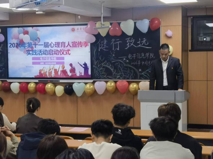 为贯彻落实教育部“健康第一”教育理念,全面落实学校第十一届“阳光护航”心理育人宣传季实践活动工作要求,深化四级心理育人网络体系建设,培育大学生自尊自信、理性平和、阳光向上的积极心理品质,4月8日,西京学院电子信息学院在2229教室举行第十一届心理育人宣传季实践活动启动仪式。学院党委书记曾皈栋、学生工作办公室主任段领、大学生心理健康教育与咨询中心教师赵素素、学院辅导员及140名心理委员代表参加仪式,仪式由学院二级心理辅导站李鹏老师主持。