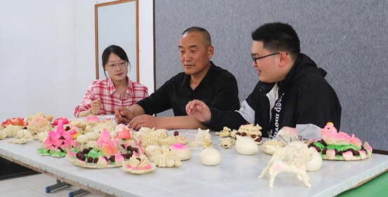 面花历史悠久,承载着丰富的民俗文化内涵,是陕西人民智慧的结晶。在面花非遗基地里,面花艺人孙学义现场展示技艺,他手法娴熟,师生们目不转睛地观察着,用心记录着面团如何通过揉、捏、剪、染等方式变身栩栩如生的“花鸟鱼虫”。“科技不是替代手艺,而是让老手艺走得更远。”带队教师刘静教授表示。参与调研的设计专业研究生段进轩感慨道:“这次调研让我对传统文化有了全新的认识,返校后我会尝试用色彩分析软件研究传统配色体系,把现代设计元素与面花艺术相结合,让面花这朵传统艺术之花,在新时代开得更加红红火火!”