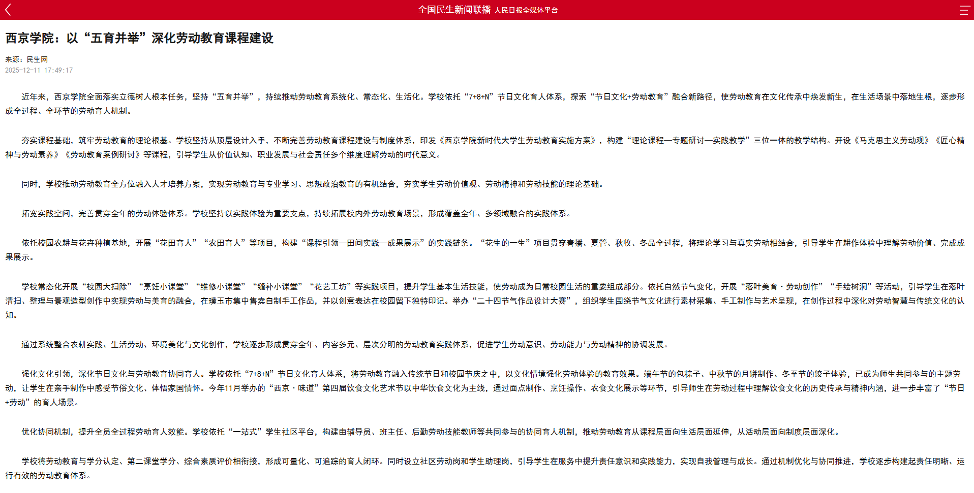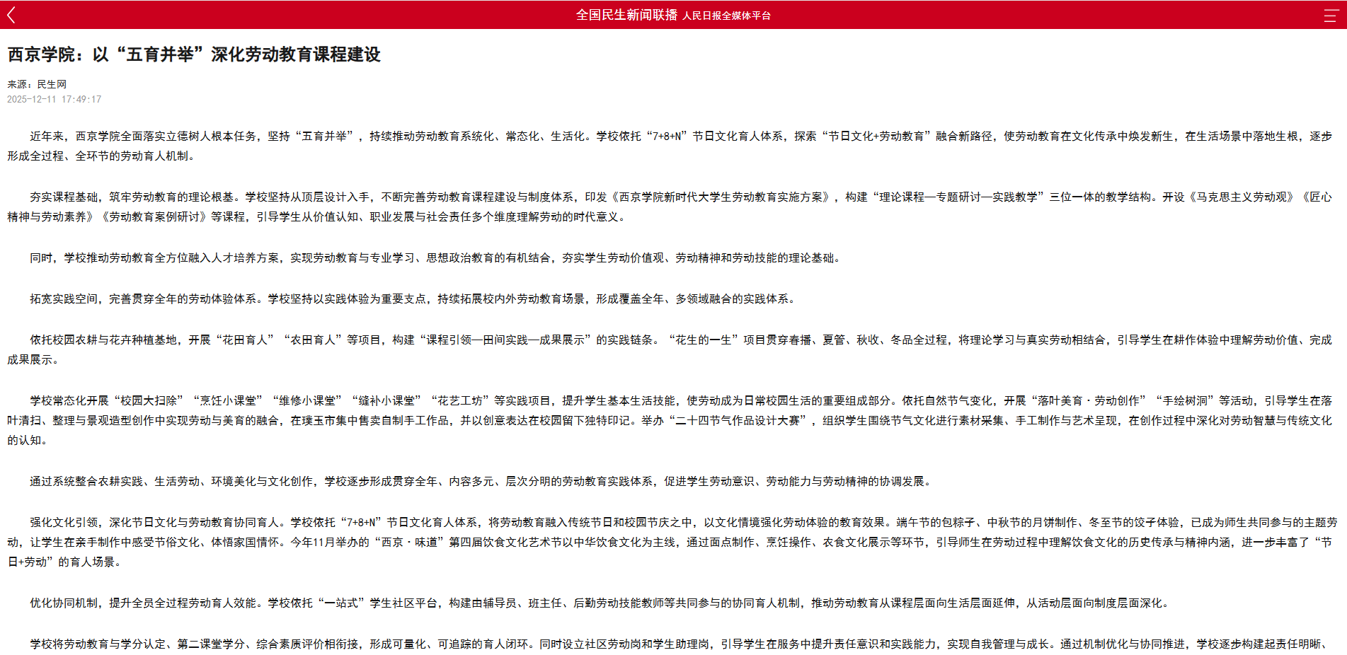 下一步,该学校将继续以“五育并举”为根本,推动劳动教育走向更深层次、更广维度。在现有实践基础上,学校将进一步探索劳动教育与学科创新、数字素养、社会服务相结合的新模式,构建更具时代性、系统性和延展性的劳动育人生态,让劳动精神持续融入每一位学生的成长历程,为培育担当民族复兴大任的时代新人注入持久而深厚的实践力量。
