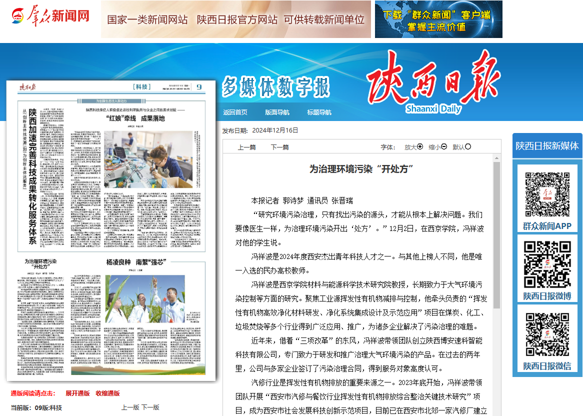 近年来,借着“三项改革”的东风,冯祥波带领团队创立陕西博安速科智能科技有限公司,专门致力于研发和推广治理大气环境污染的产品。在过去的两年里,公司与多家企业签订了污染治理合同,得到服务对象高度认可。