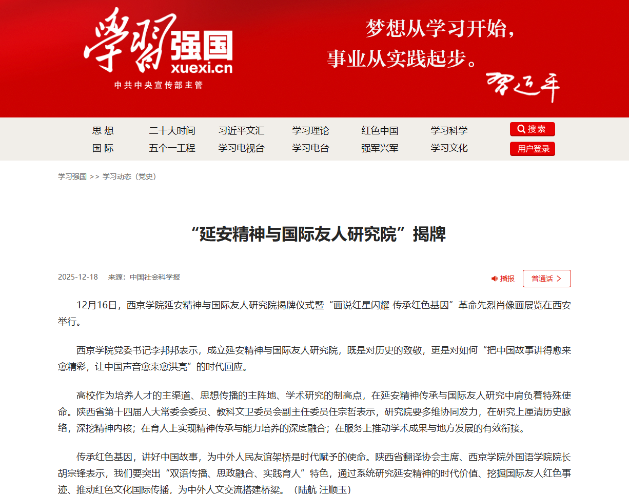 12月16日,西京学院延安精神与国际友人研究院揭牌仪式暨“画说红星闪耀 传承红色基因”革命先烈肖像画展览在西安举行。西京学院党委书记李邦邦表示,成立延安精神与国际友人研究院,既是对历史的致敬,更是对如何“把中国故事讲得愈来愈精彩,让中国声音愈来愈洪亮”的时代回应。高校作为培养人才的主渠道、思想传播的主阵地、学术研究的制高点,在延安精神传承与国际友人研究中肩负着特殊使命。陕西省第十四届人大常委会委员、...