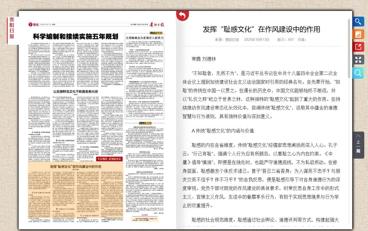 常腾 刘德林“不知耻者,无所不为”,是习近平总书记在中共十八届四中全会第二次全体会议上提到加快建设社会主义法治国家时引用的经典名句。自先秦开始,“知耻”的传统在中国一以贯之。在漫长的历史中,中国文化能够始终不断流,并以“礼仪之邦”屹立于世界之林,这种独特的“耻感文化”起到了重大的作用。在持续推动作风建设常态化长效化中,回溯传统“耻感文化”,汲取其中蕴含的道德智慧与行为准则,具有独特价值与深刻意义...
