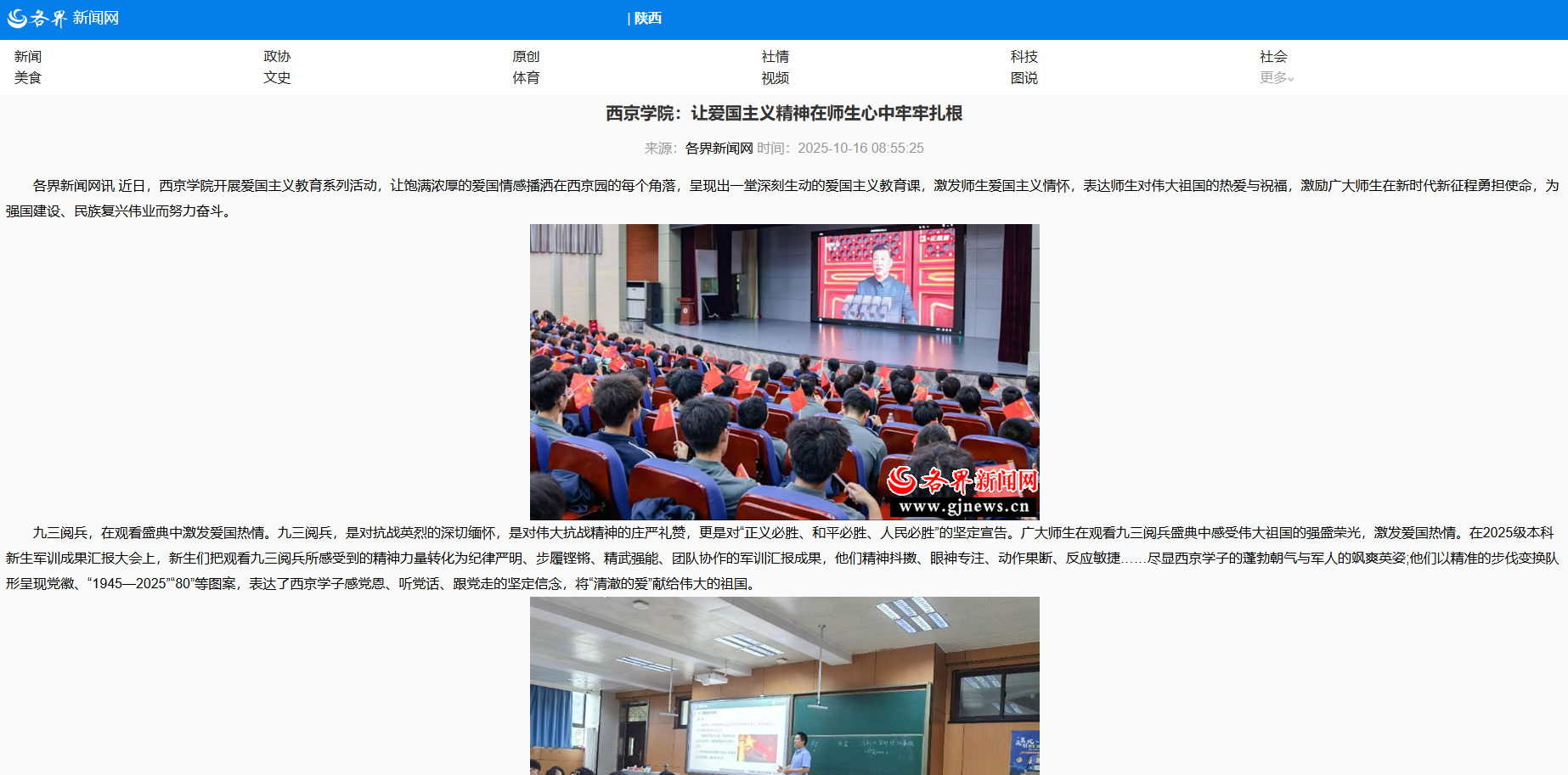近日,西京学院开展爱国主义教育系列活动,让饱满浓厚的爱国情感播撒在西京园的每个角落,呈现出一堂深刻生动的爱国主义教育课,激发师生爱国主义情怀,表达师生对伟大祖国的热爱与祝福,激励广大师生在新时代新征程勇担使命,为强国建设、民族复兴伟业而努力奋斗。九三阅兵,在观看盛典中激发爱国热情。在观看九三阅兵盛典中感受伟大祖国的强盛荣光,激发爱国热情。在2025级本科新生军训成果汇报大会上,新生们把观看九三阅兵....