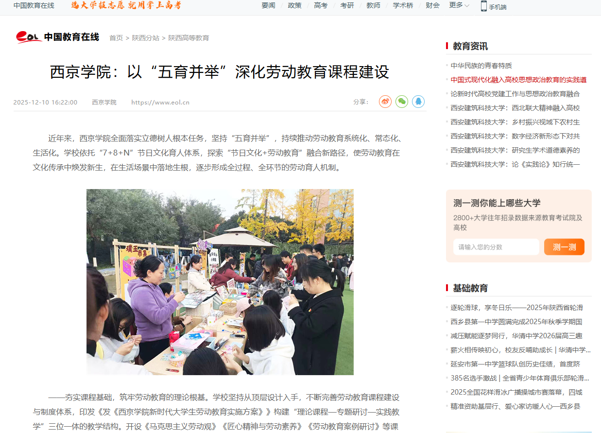 近年来,西京学院全面落实立德树人根本任务,坚持“五育并举”,持续推动劳动教育系统化、常态化、生活化。学校依托“7+8+N”节日文化育人体系,探索“节日文化+劳动教育”融合新路径,使劳动教育在文化传承中焕发新生,在生活场景中落地生根,逐步形成全过程、全环节的劳动育人机制。夯实课程基础,筑牢劳动教育的理论根基。学校坚持从顶层设计入手,不断完善劳动教育课程建设与制度体系,印发《西京学院新时代大学生劳动教育....