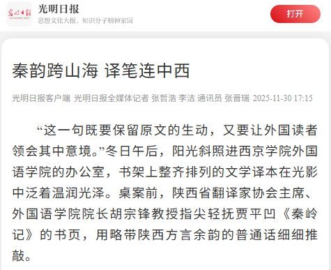 “这一句既要保留原文的生动,又要让外国读者领会其中意境。”冬日午后,阳光斜照进西京学院外国语学院的办公室,书架上整齐排列的文学译本在光影中泛着温润光泽。桌案前,陕西省翻译家协会主席、外国语学院院长胡宗锋教授指尖轻抚贾平凹《秦岭记》的书页,用略带陕西方言余韵的普通话细细推敲。旁边,西京学院外国语学院教授罗宾·吉尔班克推了推眼镜,笔尖在笔记本上快速记录。两人时而俯身比对词句,时而各自伏案批注,偶尔因...