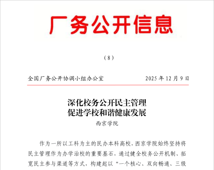 西京网讯:12月9日,全国厂务公开协调小组办公室在第8期《厂务公开信息》中,以“深化校务公开民主管理 促进学校和谐健康发展”为题,专题报道了我校构建特色民主管理体系的典型经验。报道指出,西京学院作为民办本科高校,坚持以教代会为核心载体,创新构建“一个核心、双向畅通、三级联动、四维公开、五措并举”的校务公开民主管理体系。学校早在2006年即在陕西民办高校中率先建立教代会制度,确保重大决策过程民主、结果透明...