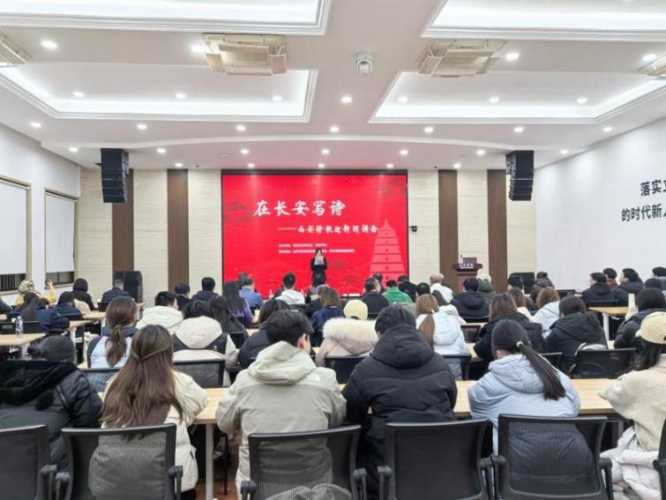 西京网讯:12月29日晚,由西安市作家协会与我校共同主办,西安市作协诗歌委员会、我校外国语学院承办的“在长安写诗”西安诗歌迎新朗诵会启幕。活动汇聚文学界人士与高校师生,以诗歌朗诵与交流的形式迎接新年。活动现场,中国石油作家协会副主席、西安市作家协会副主席第广龙,陕西省翻译协会主席、我校外国语学院院长胡宗锋教授,西安市作协诗歌委员会主任王琪、左右,小说委员会主任黄海兮,以及作家、翻译家杜琛、蒋书萍、....
