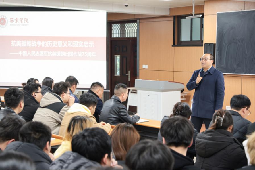 西京网讯:12月11日下午,副校长郭建新教授为电子信息学院师生代表讲授专题思政课,主题为“抗美援朝战争的历史意义和现实启示”。本次授课旨在纪念中国人民志愿军抗美援朝出国作战75周年,弘扬抗美援朝精神,引导师生坚定理想信念。课程围绕抗美援朝战争的历程、历史影响与当代启示展开阐述。郭建新引用史料回顾了战争背景,指出在建国初期艰难条件下,党中央作出“抗美援朝、保家卫国”战略决策。他通过杨根思、黄继光、邱少....
