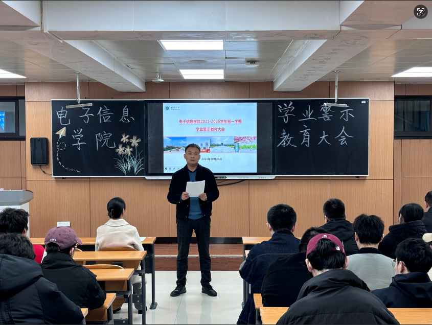 为进一步健全本科生学业帮扶长效机制,切实督促学生端正学习态度、顺利完成学业,根据学校教务处《关于开展2025-2026学年第一学期本科生学业警示工作的通知》要求,电子信息学院于10月24日召开学业警示教育大会。学院党委书记、学生工作副院长曾皈栋、教学副院长辛督强、学生工作办公室主任段领、各相关班级班主任、辅导员及全体被警示学生共同参会。会上,辛督强副院长结合学院学业管理实际,系统宣讲解读学业警示教育工作政策...
