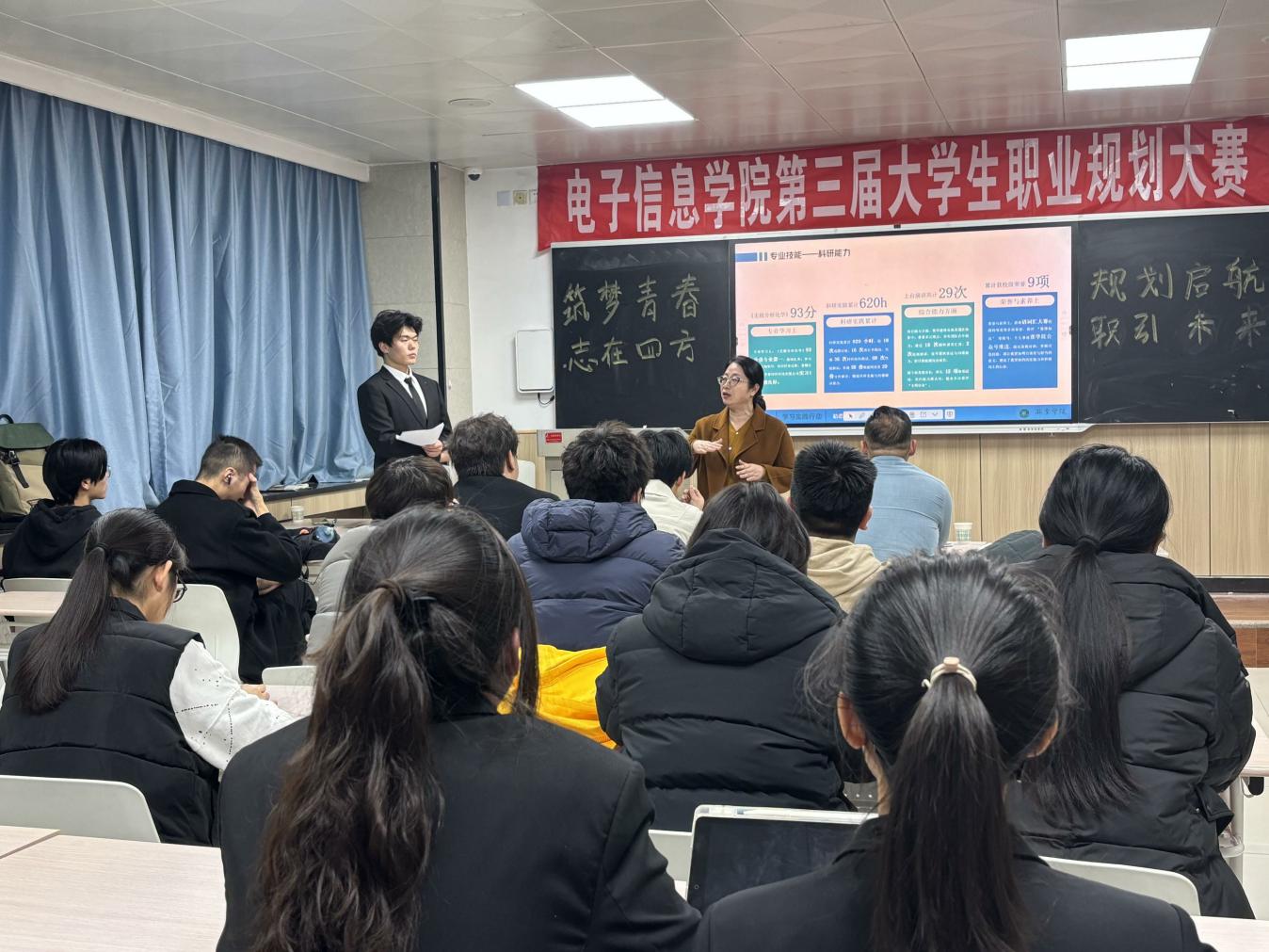 为贯彻落实学校2025年创业就业工作会议精神,增强大学生职业生涯规划意识,引导大学生树立正确的职业观念,提高职业素养和就业竞争力,11月20日电子信息学院在2303教室举办“筑梦青春志在四方,规划启航职引未来”第三届大学生职业规划大赛。电子信息学院校外辅导员陈卫妮、大学生创业就业中心办公室主任徐鹏、校友工作办公室主任王龙担任评委,学生办公室主任段领、辅导员李萍老师出席本次活动。本次比赛设就业赛道和成长赛道....